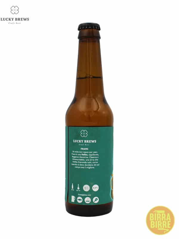 Franz è la Helles prodotta da Lucky Brews, una birra chiara dal colore giallo paglierino e dotata di una bianca schiuma persistente. Al naso offre da subito i tipici sentori maltati di una helles, pane e miele su tutto; a seguire le inconfondibili note erbacee e fruttati dei luppoli tedeschi. Dal corpo leggero e dalla vivace carbonazione, la Franz ha un gusto prevalentemente basato sul cereale, con un finale morbido e secco. Birra rinfrescante e piacevole in ogni momento della giornata, è dotata di una grande bevibilità, favorita dal tenore alcolico moderato.