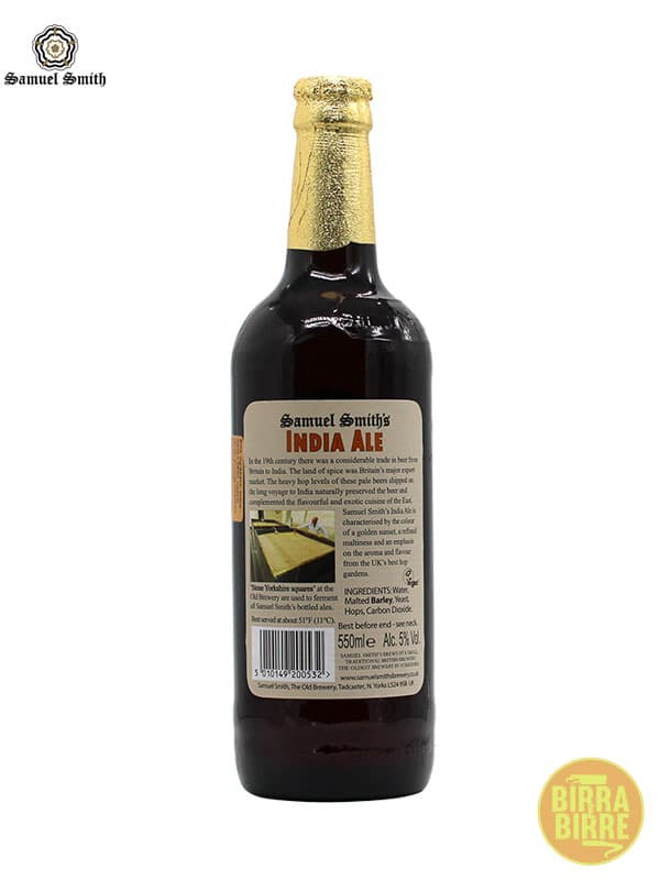 La Samuel Smith India Ale è la tradizionale ale inglese un tempo destinata a viaggiare verso le colonie inglesi nelle indie. Birra in perfetto stile Samuel Smith, esalta le caratteristiche della tradizione brassicola inglese. La India Ale di Samuel Smith presenta un colore giallo carico tendente all’ambrato e una schiuma cremosa mediamente persistente. Al naso persistono i sentori floreali ed erbacei equilibrati da note maltate di caramello, accompagnate da una fine speziatura. In bocca risulta sorprendentemente corposa nonostante il moderato tenore alcolico, grazie ai tini in pietra dello Yorkshire che ospitano la birra in fase di fermentazione. Birra equilibrata e dal finale amaro, la Samuel Smith India Ale è una birra decisamente piacevole, ideale punto di riferimento per tutte le India Ale tradizionali.