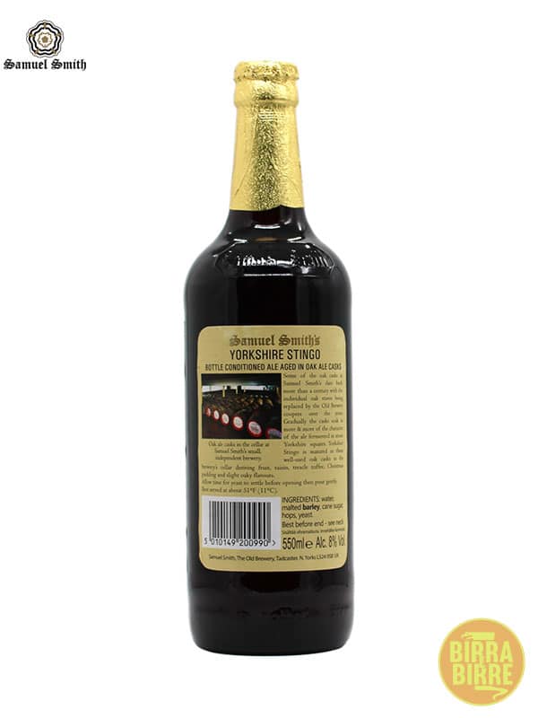 Samuel Smith Stingo è la strong ale che viene affinata un intero anno in botti di quercia centenarie le quali vengono periodicamente visionate dai birrai della brewery. La Stingo – nome che nel dialetto dello Yorkshire sostituisce il termine strong – è una birra in simbiosi con il legno che l’ha contenuta, e che le dona caratteristiche uniche. Birra dal colore ambrato con riflessi color rame e dalla fine schiuma compatta, mediamente persistente e tendente all’ocra, la Stingo presenta un bouquet ricco e complesso. Frutta, uvetta, caramello, biscotto, budino e melassa richiamano alla mente un marsala; note che riemergono in bocca, accompagnate da lievi note acidule e da una chiusura leggermente amarognola Dotata di un corpo medio e di una moderata carbonatura, la Stingo è una birra che scalda e che evolve durante la bevuta.